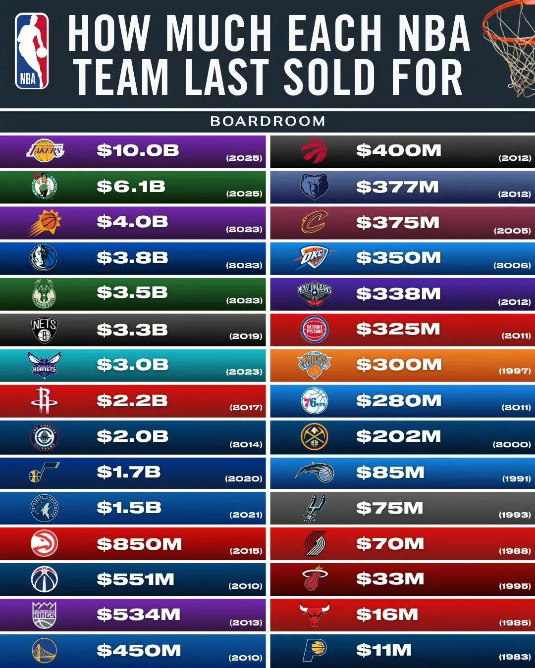 100亿售价创造了NBA球队出售纪录